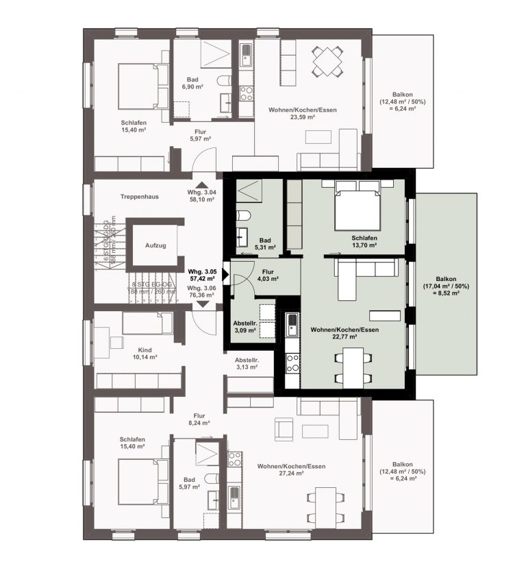 Die lichtdurchfluteten Wohnungen sind optimal nach Süden ausgerichtet, überzeugen durch zeitgemäße Architektur und den Einsatz neuester, energieeffizienter Bautechnologien. Hochwertige Ausstattung und durchdachte Grundrisse schaffen ein Zuhause mit höchstem Komfort. Alle Etagen sind zudem mit einem Personenaufzug erreichbar, für flexible und